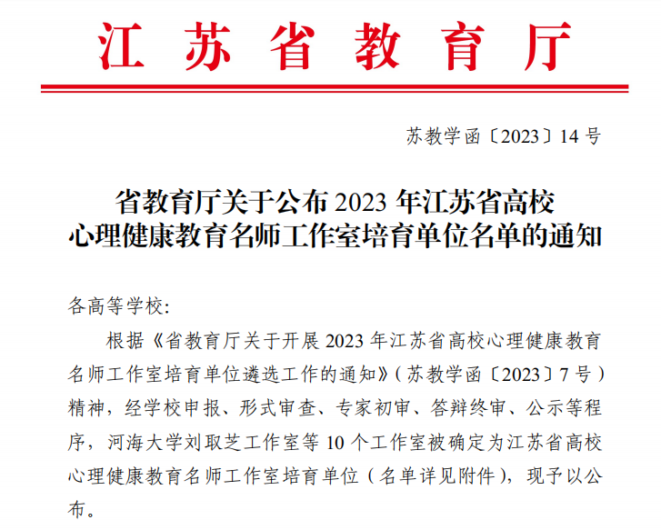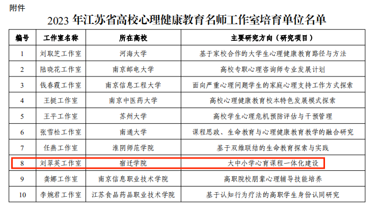 近日,江苏省教育厅发文公布2023年省高校心理健康教育名师工作室培育单位名单,经学校申报、专家初审、答辩终审等程序,我校“刘翠英工作室”凭借鲜明的研究特色、坚实的工作基础、突出的研究能力成功入选,获评全省高校心理健康教育“名师工作室”称号。据悉,全省仅有10个高校工作室最终入选。