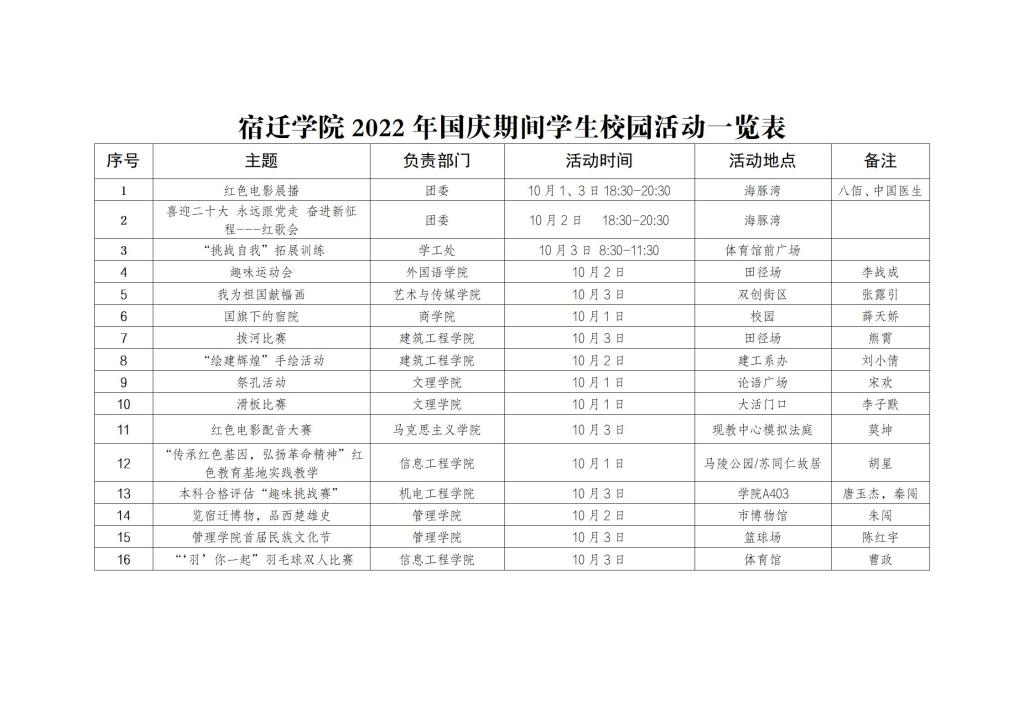 为进一步从严从紧做好国庆节假期和秋季学期疫情防控工作,确保国庆节假期间校园安定稳定和学生身体健康,充实同学们的课余生活,促进学生交流互动,营造健康和谐的校园氛围,学校决定面向在校学生开展国庆节校园活动,现将活动有关方案通知如下: